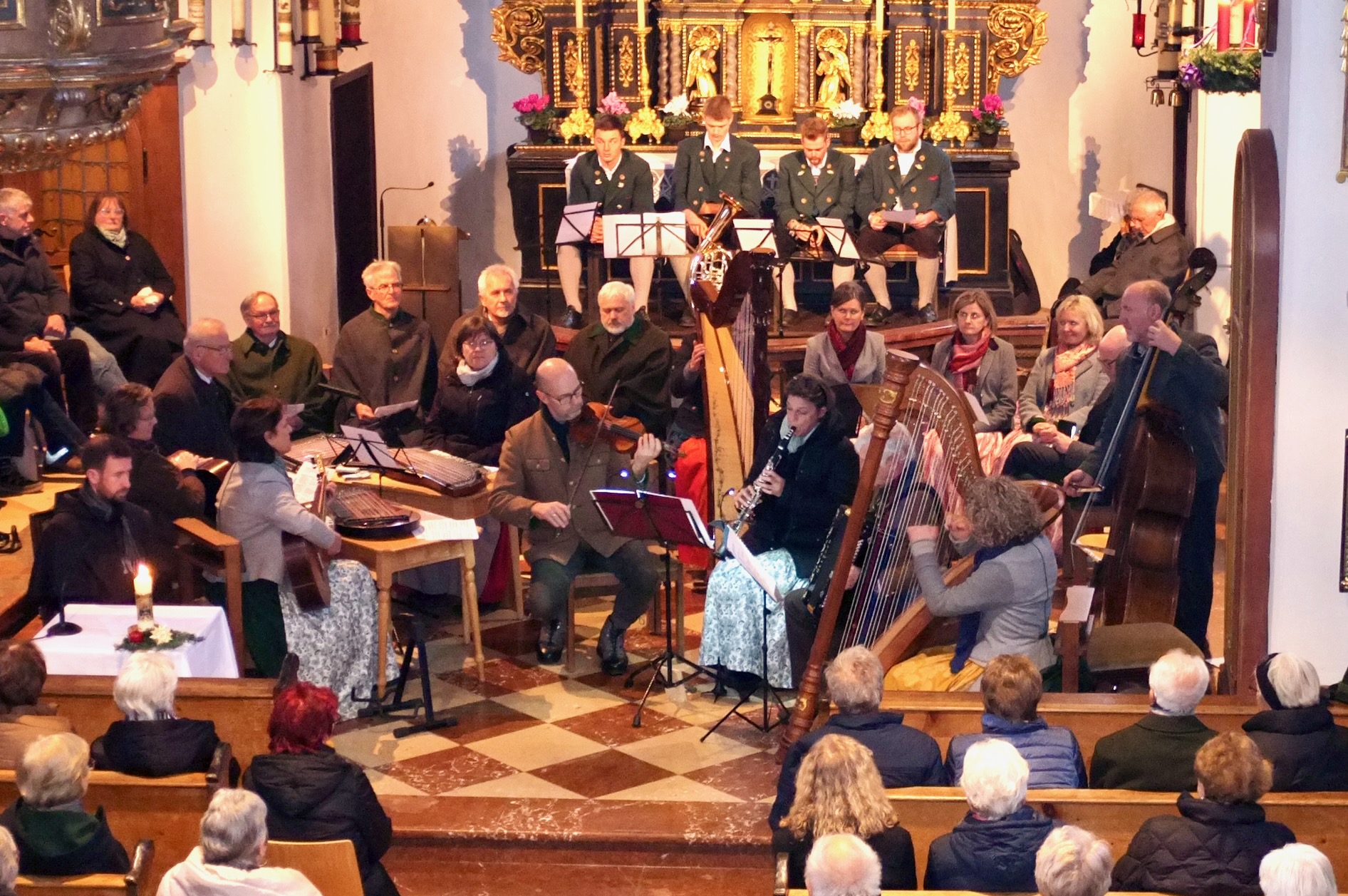 Dem schlossen sich der Saaldorfer Viergesang mit der Hoffnung „Es wird ein Stern aufgehen“ und die Vachendorfer Zithermusi mit dem „Seisenberg Marsch“ freudig an. Die Siegsdorfer Sänger fragten sich „Was is denn da drunt auf´n Land für a Röt“ und die Elstätzinger Geigenmusi leitete mit der schönen Weis „A bsondere Nacht“ über zur abschließenden „Frasdorfer Weis“ der Bläser. Nach einem gemeinsamen Gebet und dem Segen des Priesters für die Musikanten und die Besucher ging ein stimmiges und beeindruckendes „Adventliches Singen und Musizieren“ mit dem gemeinsamen Andachtsjodler und andauerndem Applaus für den wohltuenden adventlichen Sonntagnachmittag zu Ende. Die großzügigen Spenden der zufriedenen Besucher übergaben die Siegsdorfer Sänger bei der anschließenden Einkehr mit allen Mitwirkenden an die Klosterbrüder, als finanzielle Unterstützung für die anstehende Sanierung des Treppenaufgangs zur Wallfahrtskirche.